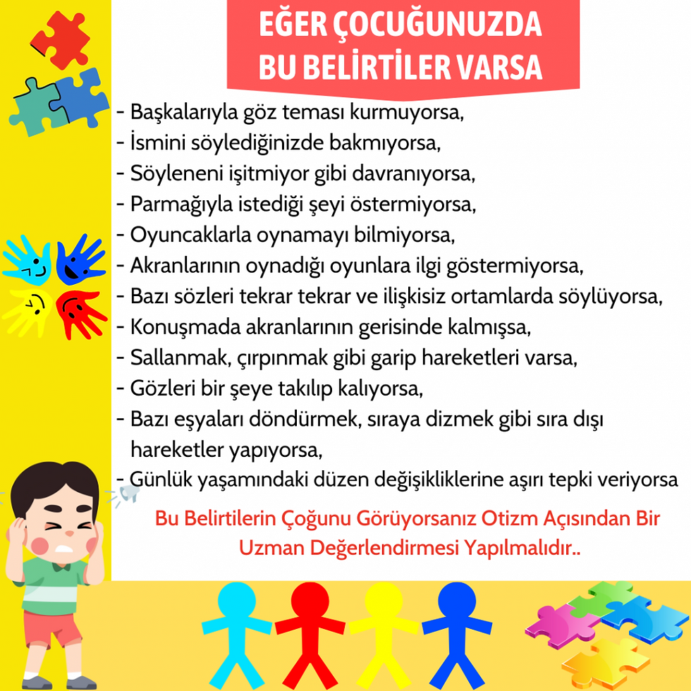 – Yine yüzünüze bakma tepkileri zayıfsa, – Anne baba nerede dediğinizde anlamıyor gibi görünüyor ise, – İsmiyle seslendiğinizde bakmıyor ama telefon, kapı çaldığında pür dikkat ise, – Yemek konusunda ciddi sıkıntılar yaşıyorsanız ( her şeyi püre yemek istemesi ya da tek tip gıdaları yemesi farklı gıdalara aşırı tepki vermesi ) – Araba tekerliği çeviriyor ya da yuvarlak nesneleri çeviriyor, kapı açılışlarına kapanışlarına fazla odaklanıyor, özellikle tavanda köşelere açılı yerlere keskin bakışlar yapıyorsa, – Aşırı heyecan ya da üzüntüde elleriyle kuş kanadı çırpışına benzer hareketler gösteriyorsa, – Reklam, müzik, müzik aleti duyduğunda elindeki her şeyi bırakıp oraya fiks oluyorsa, – Nesneleri eşyaları istediği şeyleri parmağıyla ya da gözleriyle göstermiyorsa, – “Cee- Ee oyununa” tepkisiz ise, – İsteklerini ağlayarak, başını yere sert vurarak, kusarak, oyuncakları nesneleri atarak davranış sorunu olarak size göstermeye çalışıyorsa, – Attığı oyuncağın nereye düştüğünü araştırmıyorsa, – Sarılmaktan sevilmekten huzursuz oluyorsa, – Belli kıyafetlerde huzursuzluğu ve tepkileri artıyorsa ( yünlü kıyafet, çorap giymek, battaniye, saçına toka taktırmak istememe gibi… ) – Kalabalık mekanlarda huzursuz oluyor, ağlıyor, öfke nöbetlerine giriyorsa, – Parmak ucunda yürüme ağırlıktaysa, – En önemlisi de çocuğunuzla hem sizin hem de diğer kişilerin yeterince iletişime giremediğini düşünüyorsanız